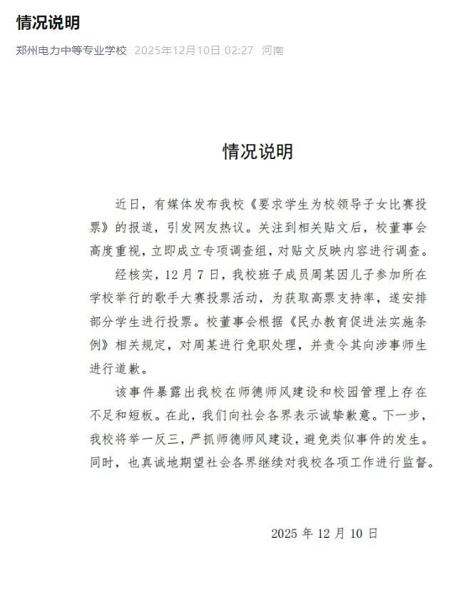 近日,有媒体发布我校《要求学生为校领导子女比赛投票》的报道,引发网友热议。关注到相关贴文后,校董事会高度重视,立即成立专项调查组,对贴文反映内容进行调查。经核实,12月7日,我校班子成员周某因儿子参加所在学校举行的歌手大赛投票活动,为获取高票支持率,遂安排部分学生进行投票。校董事会根据《民办教育促进法实施条例》相关规定,对周某进行免职处理,并责令其向涉事师生进行道歉。